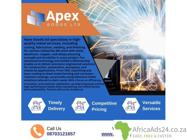 Apex Goods ltd specializes in high-quality metal services, including cutting, fabrication, welding, and finishing for various industries. We work with steel, aluminum, copper, and alloys, ensuring strength and durability in every project. Our advanced technology and skilled craftsmanship enable us to deliver precision-engineered solutions for construction, automotive, aerospace, and industrial applications. From CNC machining and laser cutting to sheet metal forming and corrosion-resistant coatings, we provide comprehensive metal solutions tailored to client needs. With a focus on efficiency, innovation, and customer satisfaction, we help businesses achieve high-performance results while maintaining cost-effectiveness and sustainability. Partner with us for excellence.